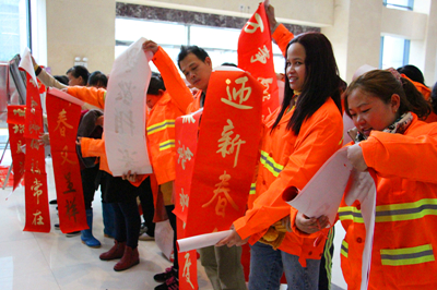 “春滿(mǎn)人間百花吐艷 福臨小院四季常安” “一帆風(fēng)順年年好 萬(wàn)事如意步步高” ……126日至28日,麗匯大廈一樓熱鬧非凡,為了感激社會(huì )各界對綠港集團的關(guān)心與支持,由綠港集團工會(huì )組織的書(shū)法家“迎新春 送祝?!绷x務(wù)送春聯(lián)活動(dòng)吸引了大量前來(lái)求墨寶的社會(huì )各界人士。三位南寧市書(shū)法協(xié)會(huì )的書(shū)法家以及南寧科巨公司副總經(jīng)理陸章發(fā)為觀(guān)眾們現場(chǎng)揮毫,一幅幅金燙燙、散發(fā)著(zhù)墨香的春聯(lián)映襯著(zhù)人們的笑臉,整個(gè)現場(chǎng)彌漫著(zhù)濃濃的年味,短短三天時(shí)間便送出了2000多副春聯(lián)。126日上午,綠港集團工會(huì )還啟動(dòng)了派送春聯(lián)儀式,綠港集團工會(huì )主席黃麗琴帶領(lǐng)工會(huì )人員將春聯(lián)送到經(jīng)開(kāi)區40余位保潔人員、園林綠化工人、公司職工的手上。(張彩秀/文、圖)