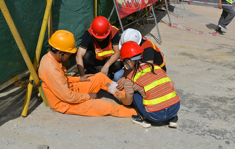 現場(chǎng)模擬一名工人在2#、3#廠(chǎng)房間的廊架上進(jìn)行施工作業(yè)時(shí),因未系安全帶、腳下未踩穩造成高處墜落受傷,其他人員對其進(jìn)行急救的情況。從發(fā)現人員墜落受傷、疏散人群、封鎖現場(chǎng)到對受傷人員骨折部位用夾板進(jìn)行固定再送至醫院,僅歷時(shí)10分鐘。整個(gè)過(guò)程緊張有序,應急處理得當。演練中,現場(chǎng)每名救援人員嚴肅認真對待每個(gè)演練細節。各應急小組聞聲而動(dòng),各司其職,反應迅速,各環(huán)節無(wú)縫銜接,使救援任務(wù)得以順利完成。