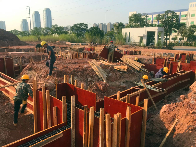 瑞聲南寧光學(xué)項目主產(chǎn)高精密手機鏡頭,包括一體式VCM雙攝、晶圓級玻璃(WLG)鏡頭、玻塑混合鏡頭等,是瑞聲核心技術(shù)之一,項目的盡快投產(chǎn)對于瑞聲公司在美國打壓中國通訊產(chǎn)業(yè)的大環(huán)境下?lián)屨籍a(chǎn)業(yè)鏈轉移先機,搶占市場(chǎng)份額;經(jīng)開(kāi)區落實(shí)自治區強首府戰略、打造千億產(chǎn)業(yè)園等都有著(zhù)十分重要的意義,是一個(gè)多贏(yíng)格局。項目計劃2020年2月上旬正式投產(chǎn)。榮鑫公司在該項目中主要承擔附屬工程施工,包括設備用房、污水處理廠(chǎng)房、危品庫、空壓機房主體施工及園區道路、綠化等,是名符其實(shí)的配角,但在項目的前期階段,聚光燈卻始終照在這“配角”的身上。附屬工程中,設備用房、污水處理廠(chǎng)房等建筑面積共4000平方米,是項目裝修、安裝的基礎工程,投產(chǎn)倒排工期要求2019年12月25日前必須完成并交付安裝單位(道路綠化等配合項目總進(jìn)度,不在此列),工期不足三個(gè)月!該部分用房面積雖不大,且大部分只有兩層,但由于特殊設計要求且項目處回填區域,涉及樁基、深基坑(5.5米)、高支模(8.3米)、防滲防腐等土建施工難點(diǎn)、費時(shí)點(diǎn),不可控因素多,給工程按期完工帶來(lái)了極大的困難。該部分項目工程量不大,與后期裝修、安裝關(guān)系密切,本應由裝修總包單位統一施工,但裝修單位一再推托,坦言不可能完成。最終管委將此部分項目授與了榮鑫公司。此時(shí),裝修、安裝單位在觀(guān)望,業(yè)主、建設主管部門(mén)也都在捏把汗。