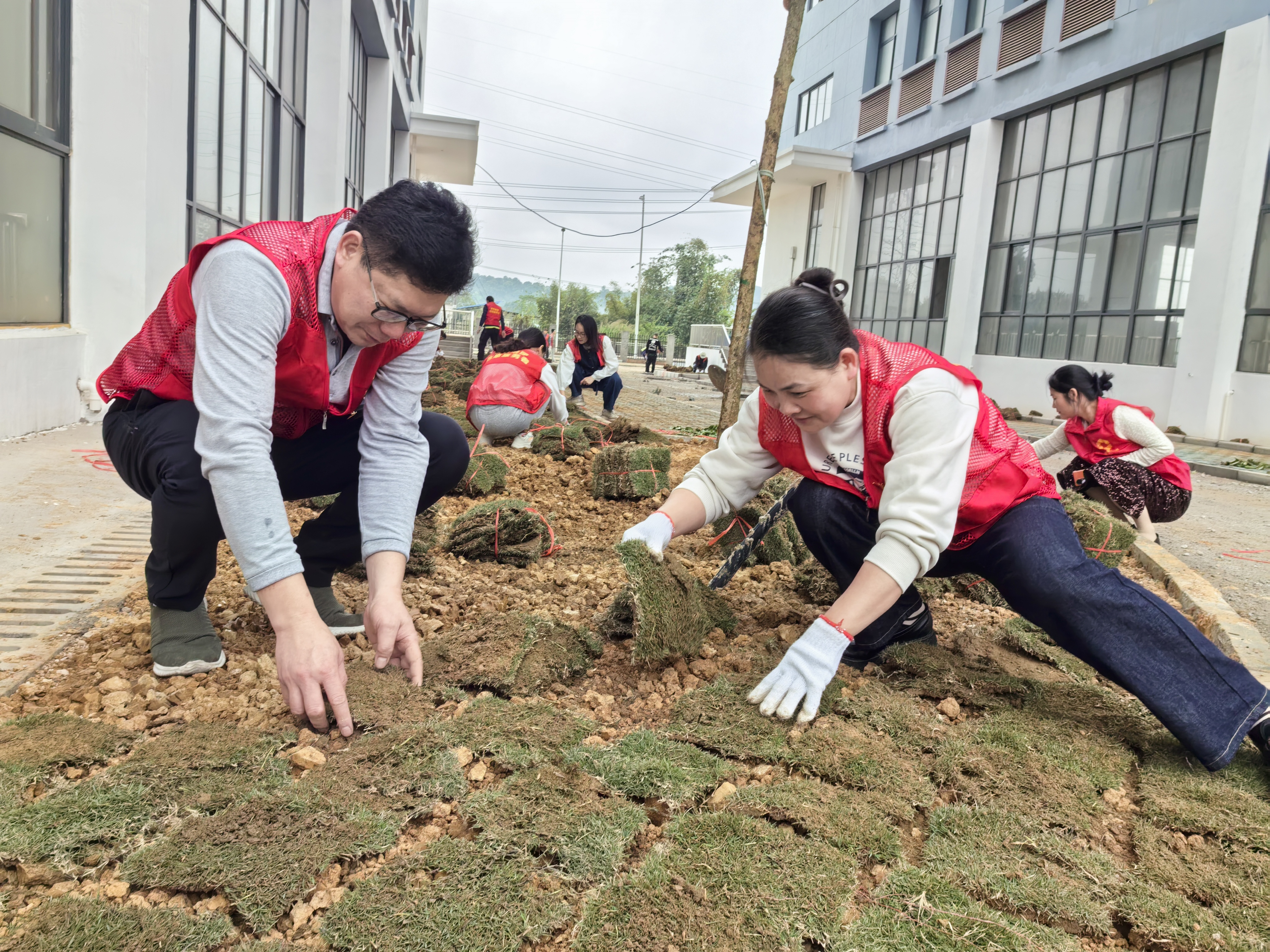 “這棵樹(shù)苗要扶正,不然長(cháng)大后會(huì )歪的?!?/span>榮鑫公司黨支部委員、副總經(jīng)理唐欽月一邊指導身邊的同事,一邊用腳輕輕踩實(shí)樹(shù)苗周?chē)哪嗤痢?/span>笑著(zhù)說(shuō):“植樹(shù)就像培養孩子,一開(kāi)始就要打下好基礎?!?/span>的臉上掛著(zhù)汗珠,但眼神中滿(mǎn)是認真。不遠處,年輕的入黨積極分子楊文君正和同事們一起鋪設草皮。他們動(dòng)作熟練,配合默契,不一會(huì )兒就鋪出了一大片嫩綠的草地。楊文君擦了擦額頭的汗水,笑著(zhù)說(shuō):“今天雖然累,但看到這片新綠,心里特別踏實(shí)。作為入黨積極分子,和黨員們一起為生態(tài)環(huán)境出一份力,感覺(jué)特別有意義。